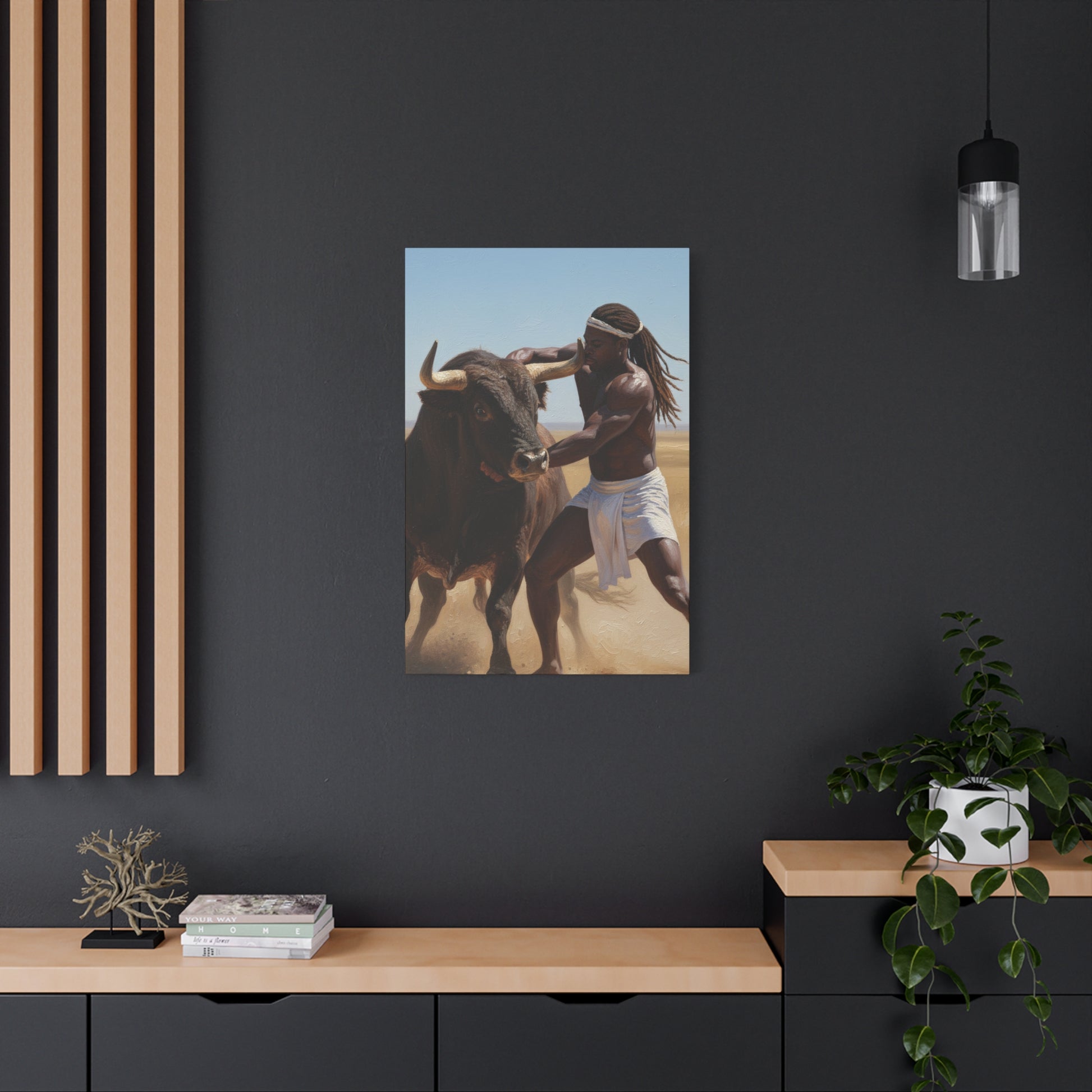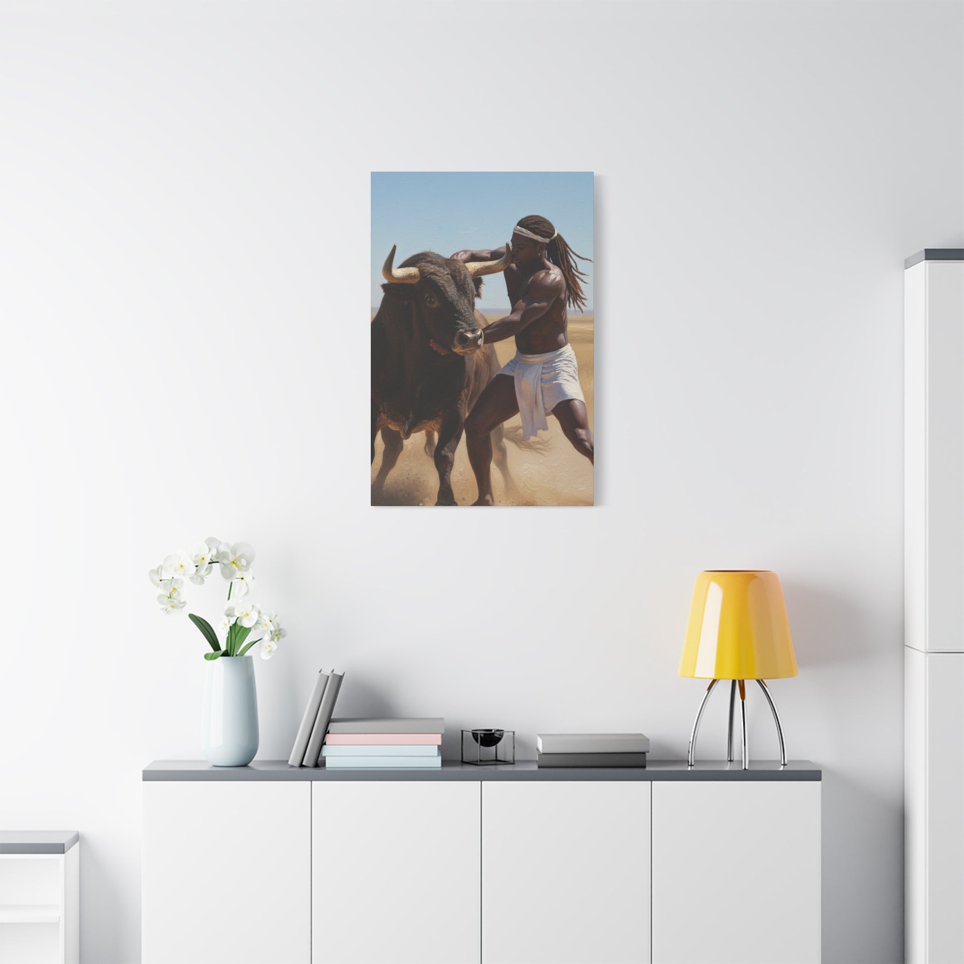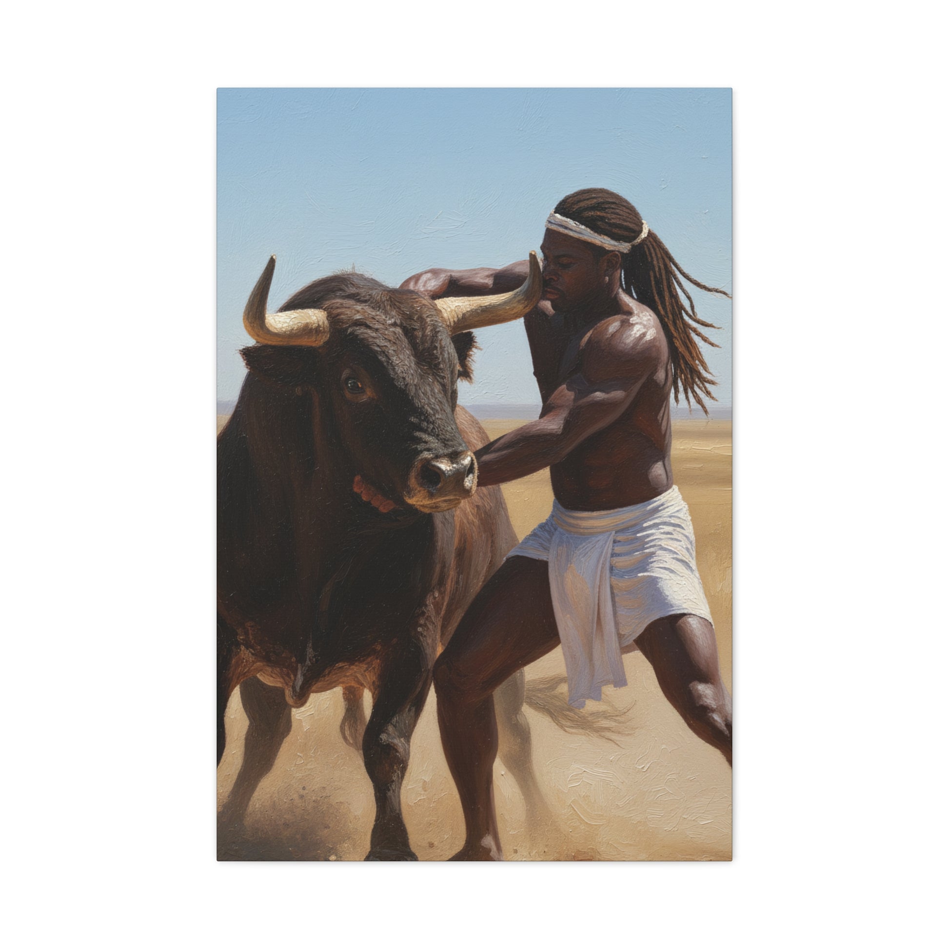 A masterpiece of raw human power. A warrior grapples with a powerful bull, symbolizing primal determination and victory over the wild.